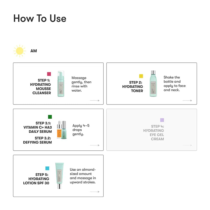 - PURIFY: Artistry Skin Nutrition™ Hydrating Mousse Cleanser – Dampen skin with fresh, warm water. Apply 1–2 pumps onto hands and massage over the skin. Rinse thoroughly and pat dry. Avoid direct contact with eyes.