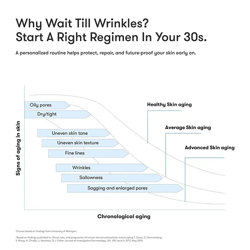Since your skin is shaped by its profile—dry, combination-to-dry skin^—and by the journey it goes through as life evolves, visible signs of skin aging need to be addressed at the right time with skincare that’s tailored for your age, tuned to your skin, and timed to your routine.