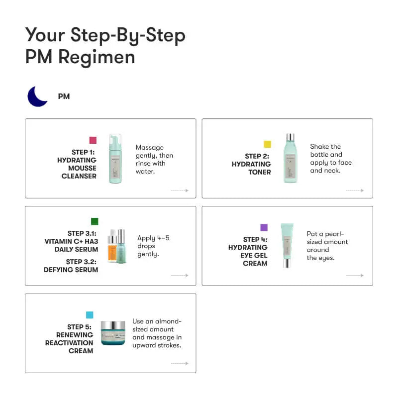 • STEP 3.1 REBUILD: Artistry Skin Nutrition™ Vitamin C + HA3 Daily Serum (activate before use) – For full-face application, apply 4–5 drops to skin after cleansing and toning every morning and evening. Avoid direct contact with the eyes. Follow with a daily skincare serum and moisturizer.