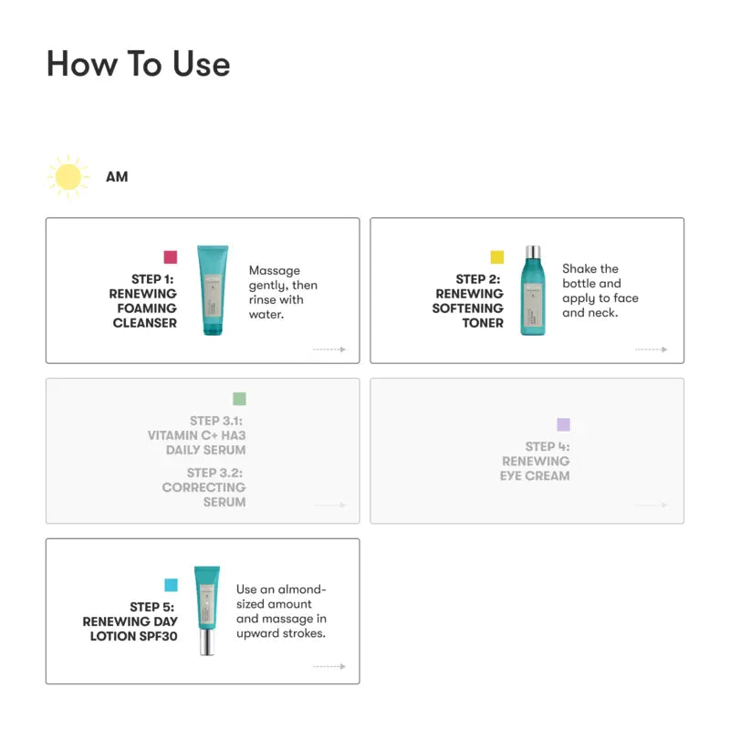 • PROTECT: Artistry Skin Nutrition™ Renewing Reactivation Day Lotion – Apply 2–3 pumps onto hands and smooth evenly in upward motions over face and neck. Avoid eye area.