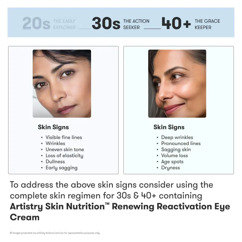 Brighten and reawaken your eyes in your 30s and 40s with Artistry Skin Nutrition™ Renewing Reactivation Eye Cream. Look your best – More youthful-looking eyes, all day, every day. Specially designed to address moderate to advanced signs of aging with oily to combination – oily skin and dry to combination – dry skin.