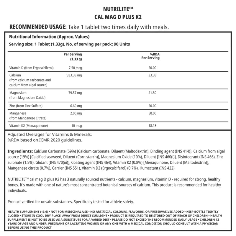 INGREDIENTS : Calcium Carbonate (59%) [Calcium carbonate, Diluent (Maltodextrin), Binding agent (INS 414)], Calcium from algal source (19%) [Calcified seaweed, Diluent (Corn starch)], Magnesium Oxide (10%), Diluent [INS 460(i)], Disintegrant (INS 466), Zinc sulphate (1.5%), Glidant [INS 470(iii)], Coating agent (INS 464), Vitamin K2 (0.8%) [Menaquinone, Diluent (Maltodextrin)], Manganese citrate (0.7%), Carrier (INS 551), Vitamin D2 (Ergocalciferol) (0.7%), Humectant (INS 422).