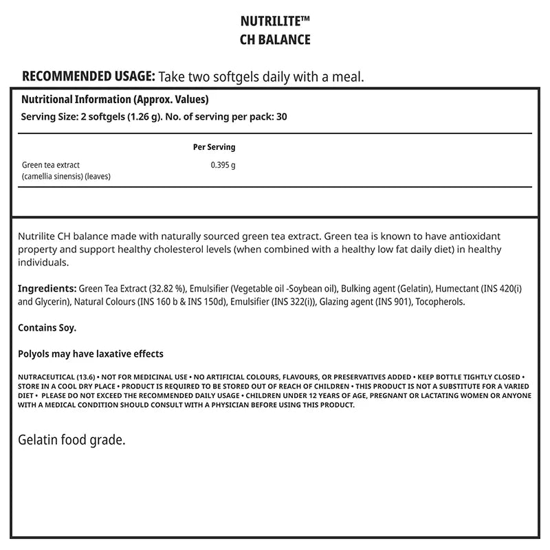 Each serving of the Nutrilite® Ch Balance provides the body with 395 mg of green tea extract. A combination of green tea polyphenols Theaflavins and Catechins work by binding to the cholesterol in the intestine and enabling it to pass through the body, with minimal absorption. A secondary mode of action begins in the liver which after detecting the reduced levels of dietary cholesterol, increases the uptake of LDL cholesterol from the blood to make bile.