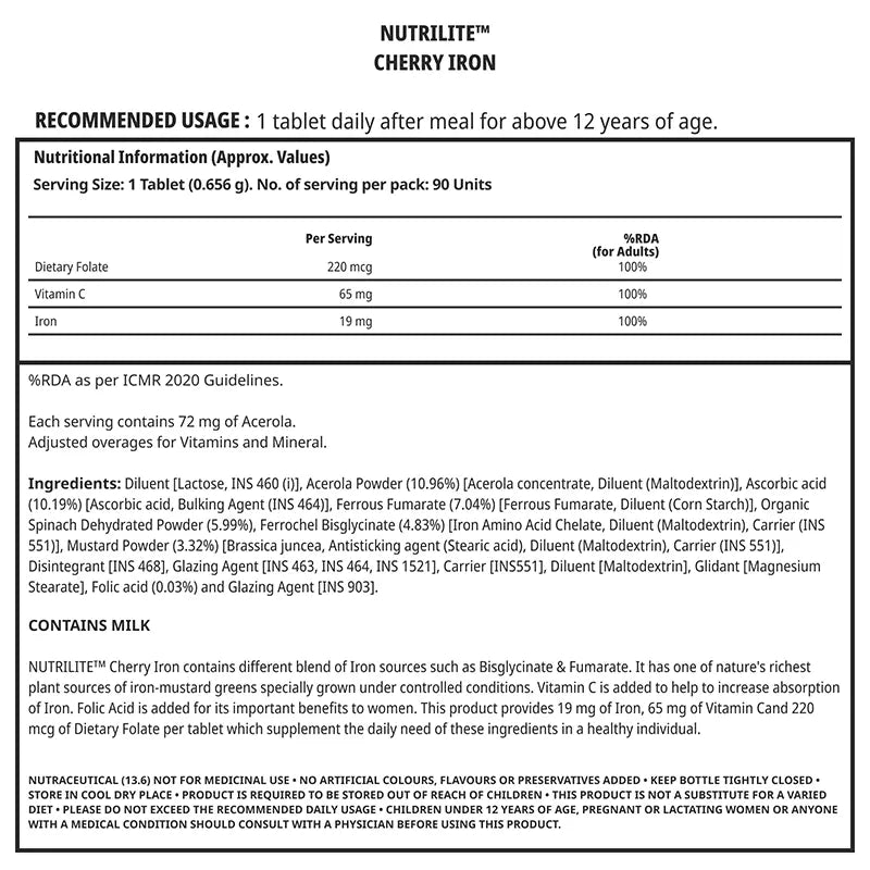 Nutrilite Cherry Iron with higher nutrient value. (as compared to previous Nutrilite Cherry Iron, nutrient values revised as per guidelines of ICMR 2020). Packed with Iron, Vitamin C and Dietary Folate to offer everyday support for your Iron needs.