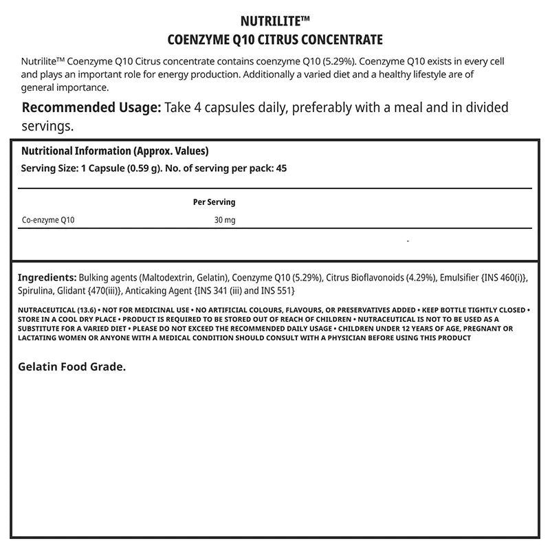 INGREDIENTS: Bulking agents (Maltodextrin, Gelatin), Coenzyme 010 (5.29%), Citrus Bioflavonoids (4.29%), Emulsifier (INS 460(;)}, Spirulina, Glidant (470(1i)}, Anticaking Agent {INS 341(18) and INS 551}