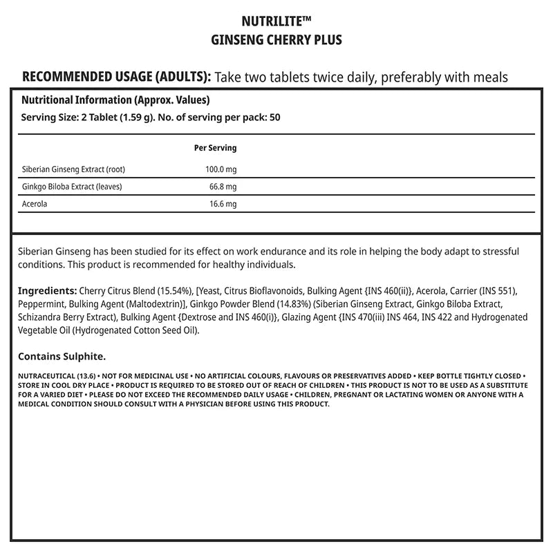 NUTRILITE®'s Ginseng Cherry Plus contains Siberian Ginseng, Acerola concentrate, Schisandra extract, Citrus Bioflavonoids, Peppermint extract, and Ginkgo Biloba extract.