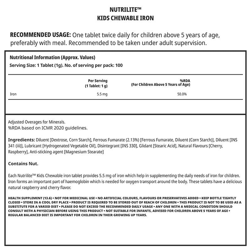 Nutrilite Kids Chewable Iron is an iron supplement meant for children. It has a delicious natural raspberry - cherry flavor.