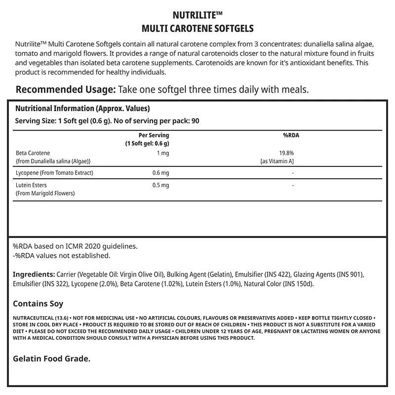 For best results, take one Multi Carotene Softgel thrice daily along with your meals. Keep the bottle closed tightly and store it in a cool, dry place.
